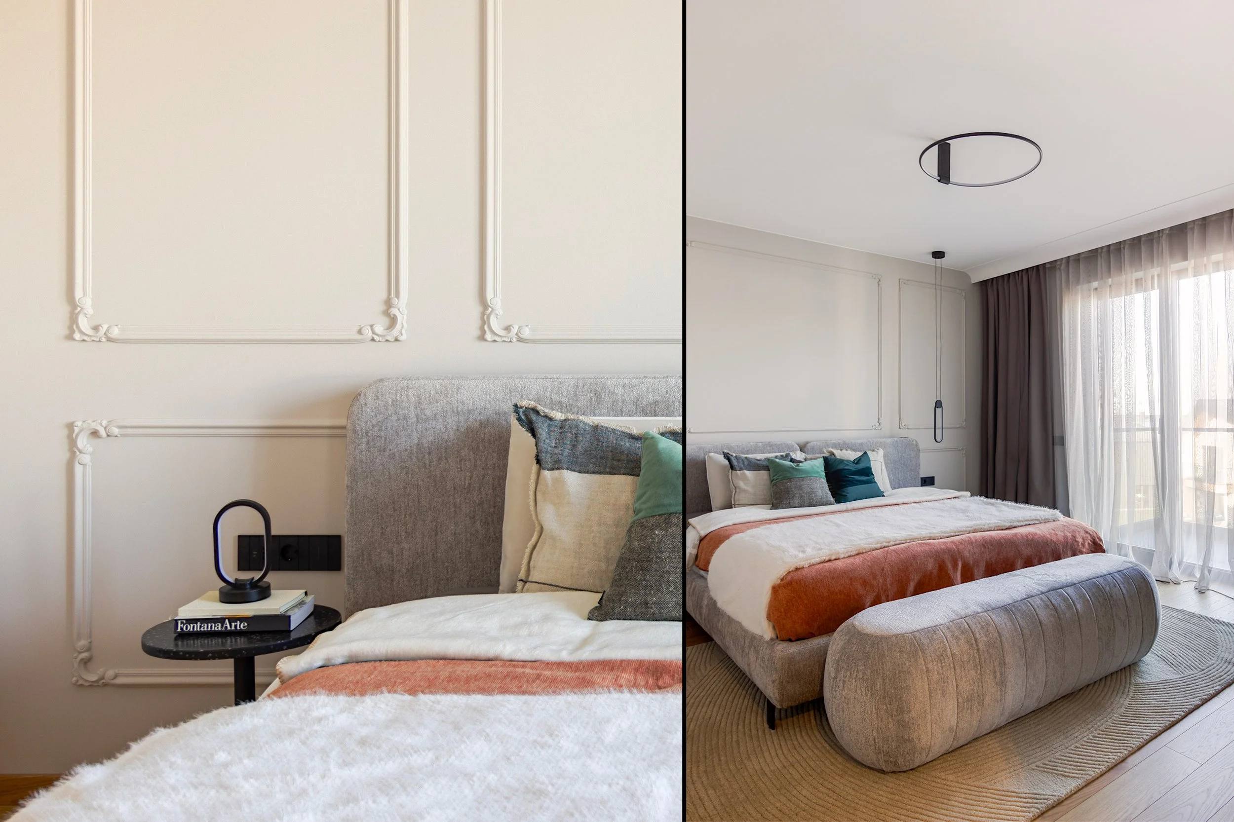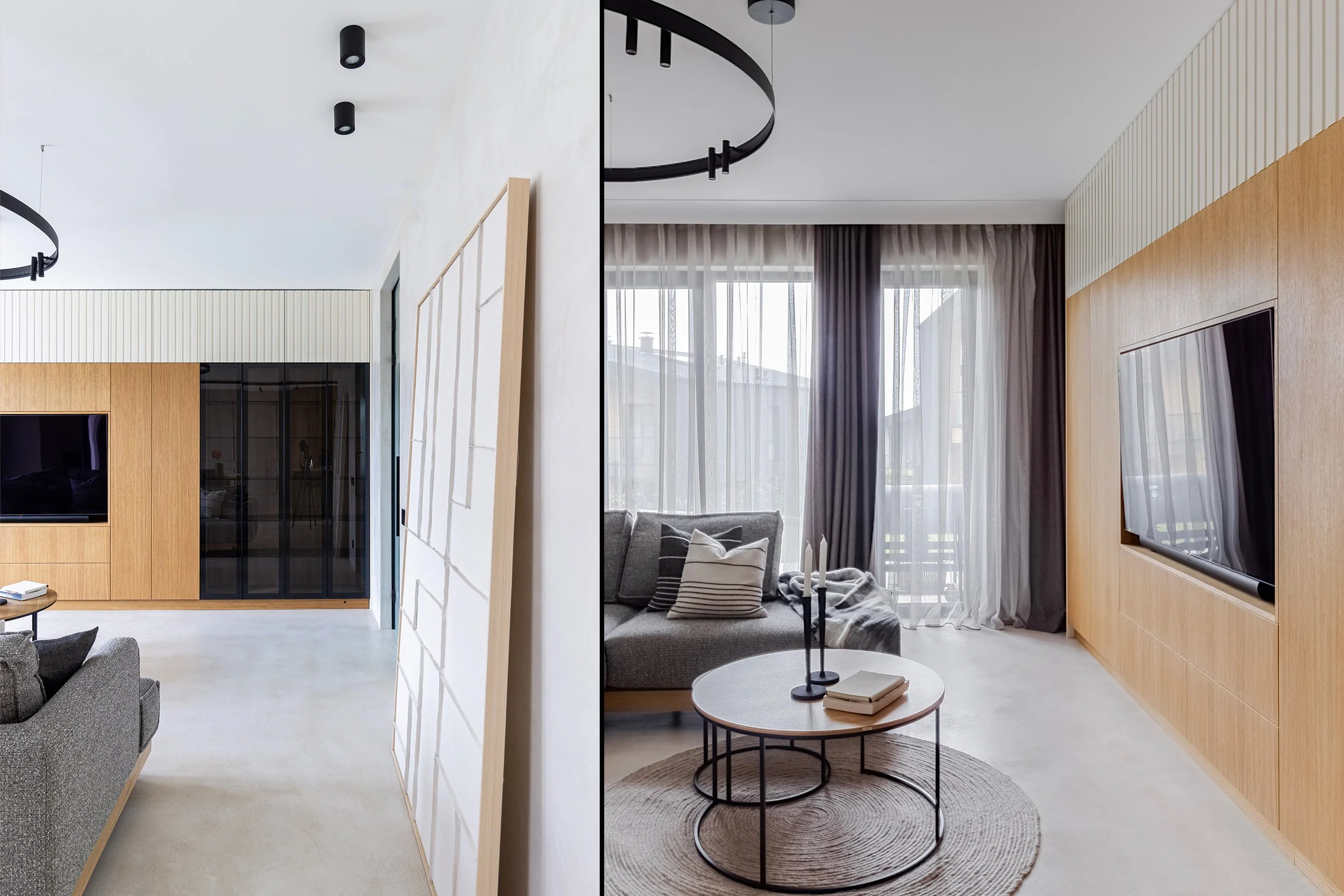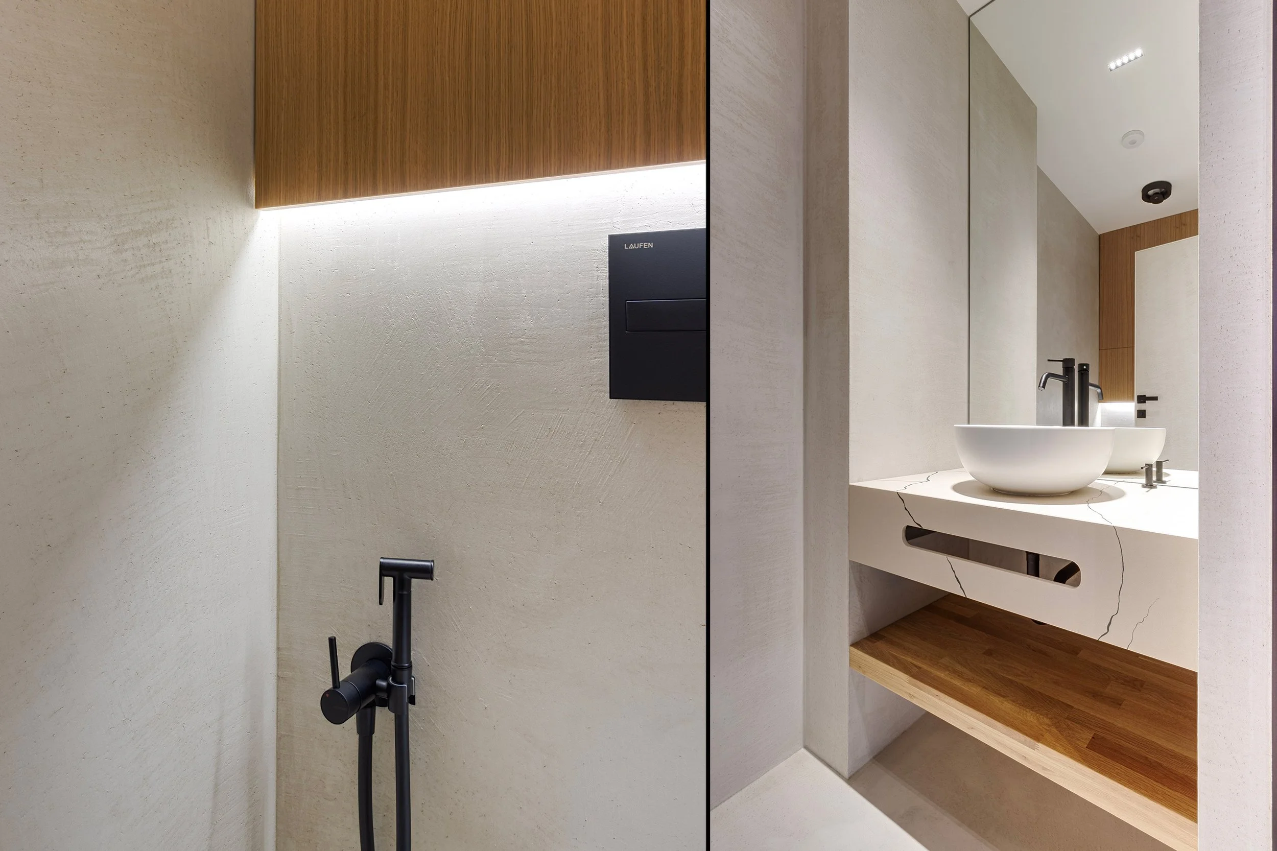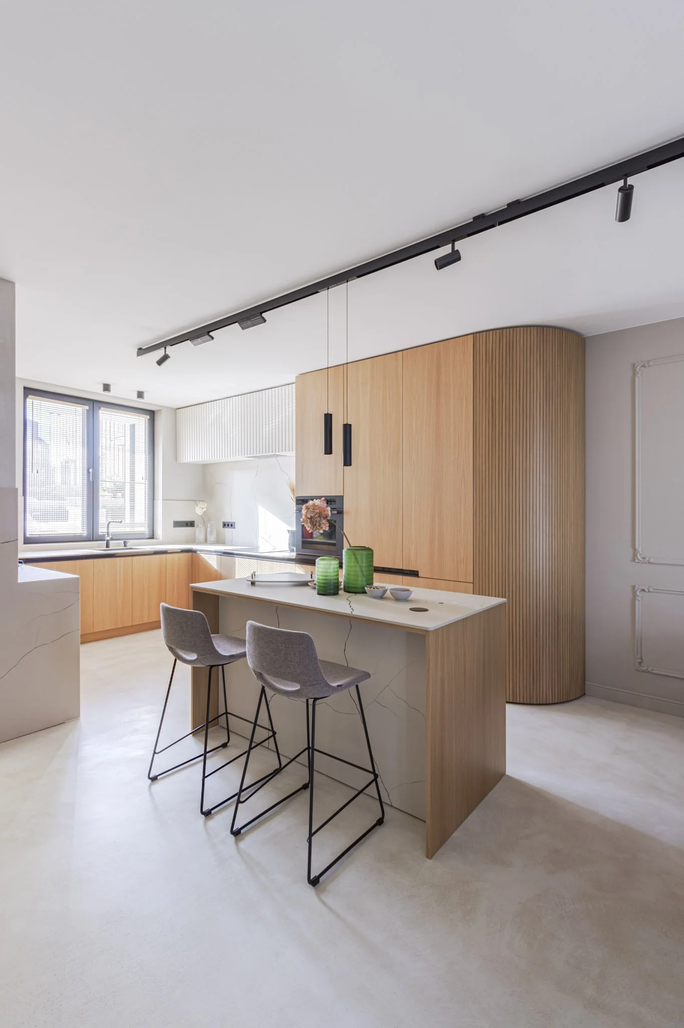 Wood Accents: Oak panels and cabinetry balance the coolness of stone and microcement, adding warmth and inviting texture.