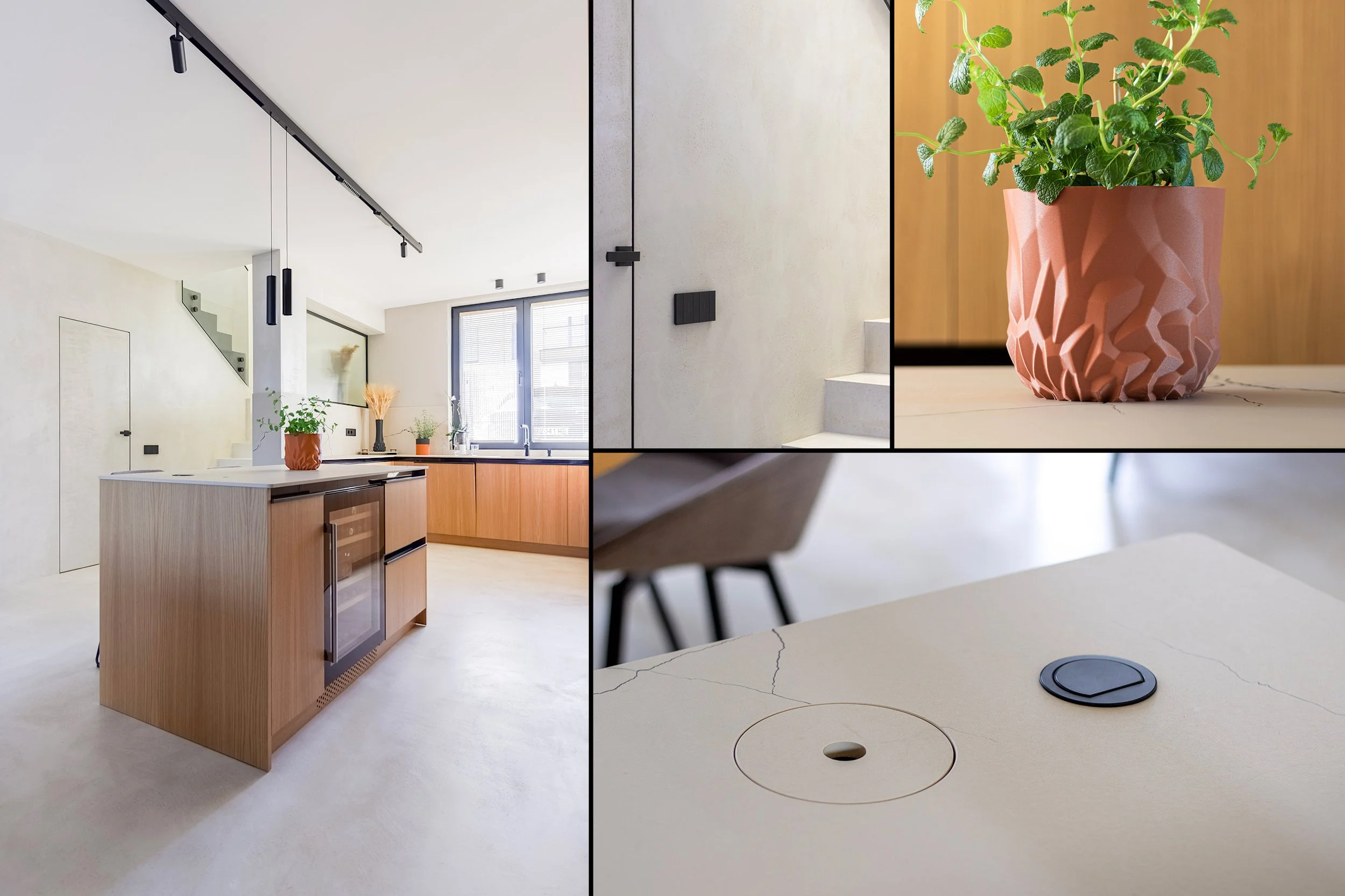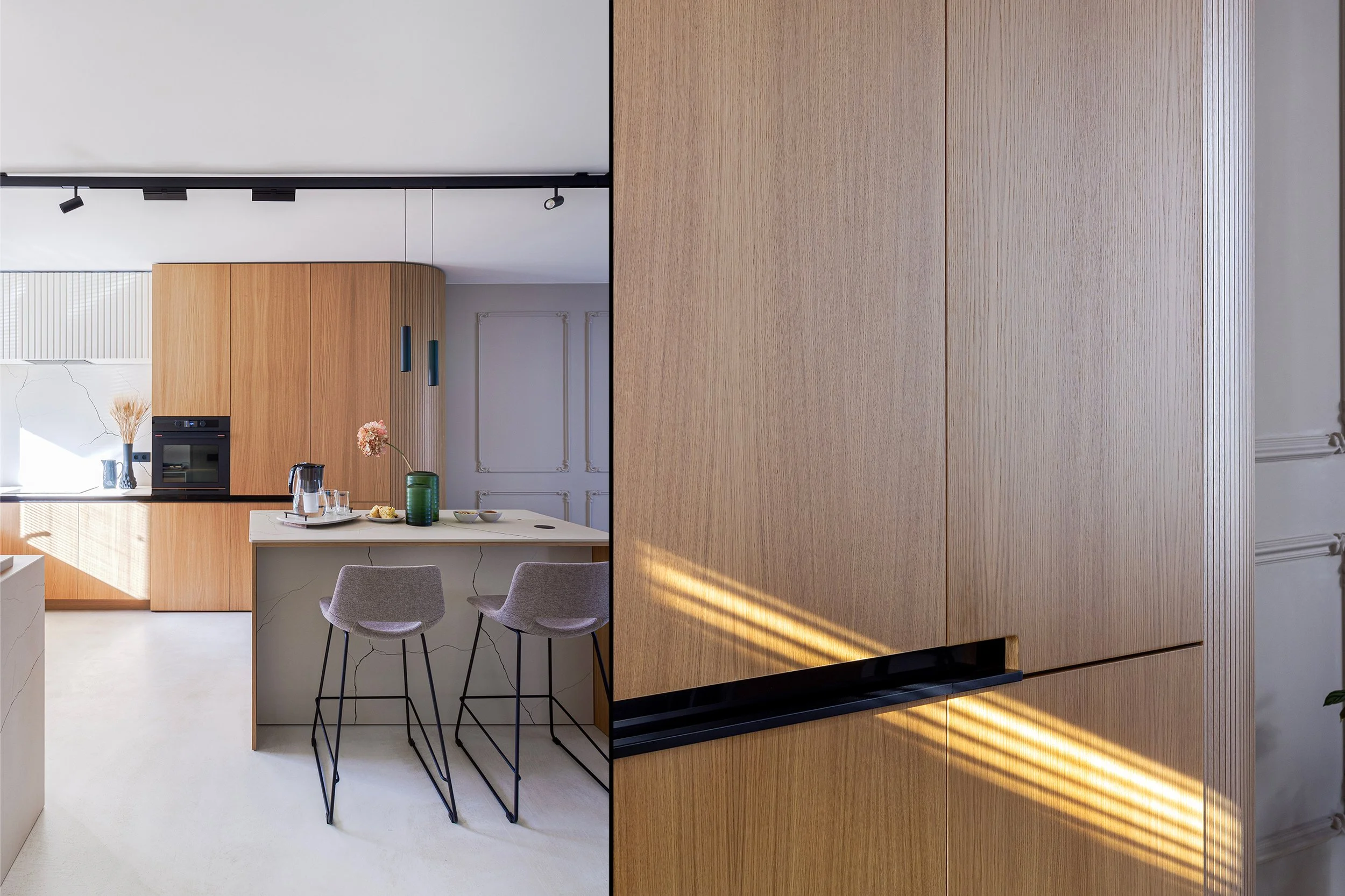 The kitchen design captures simplicity and functionality with a strong visual presence. Vertical textures on the cabinetry in natural oak are paired with sleek white porcelain backsplashes, accentuated by the dramatic dark veins of Brazza stone. Black elements, such as built-in appliances, sockets, and edging details, add a modern contrast, while soft natural light enhances the tactile qualities of the materials.
