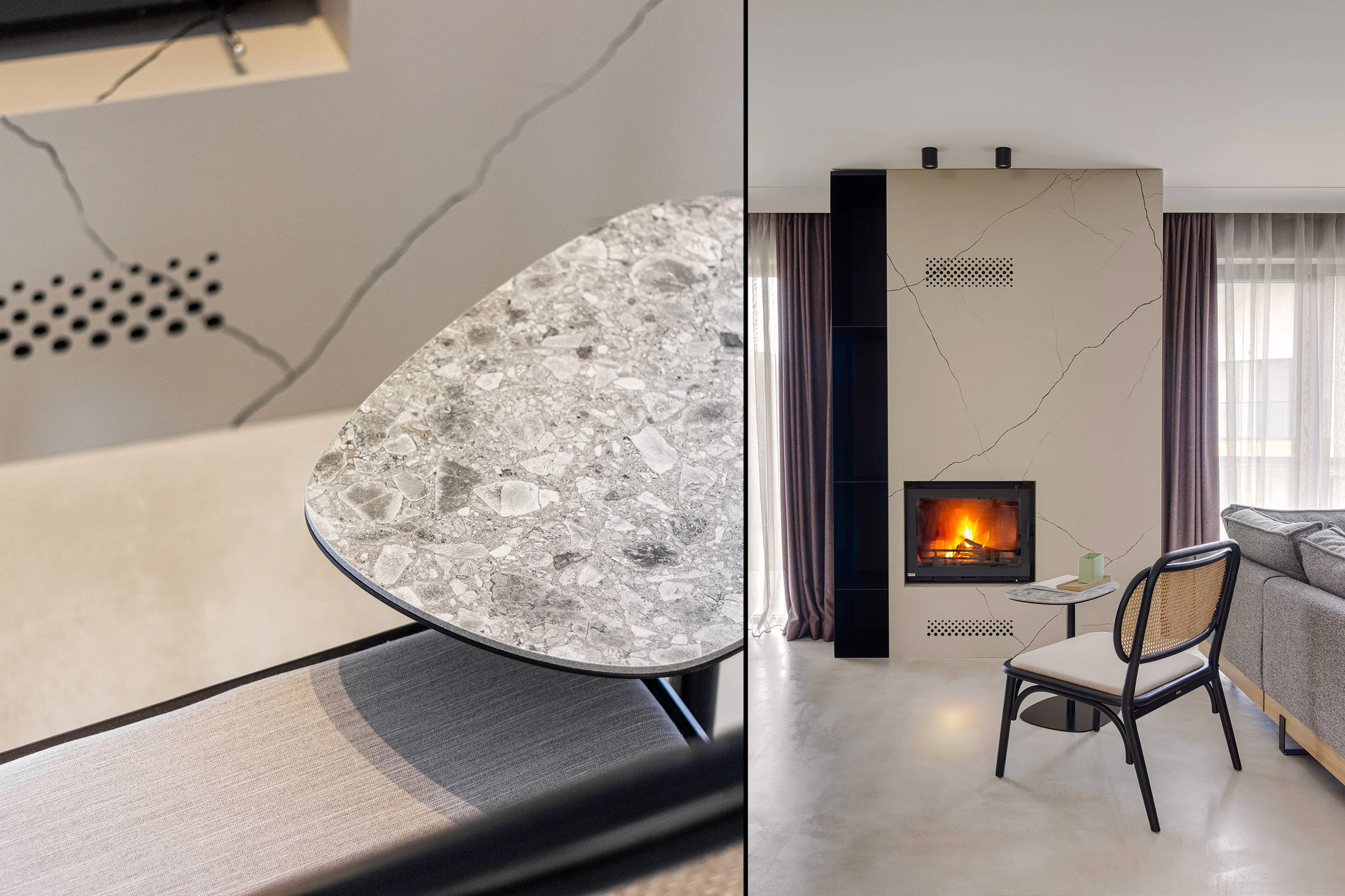 The kitchen island, clad in stone with striking veining, serves as a sculptural focal point, bridging the kitchen and dining areas while maintaining functionality. A wood-burning fireplace in the living area enhances the cozy atmosphere, complementing the clean yet inviting design.