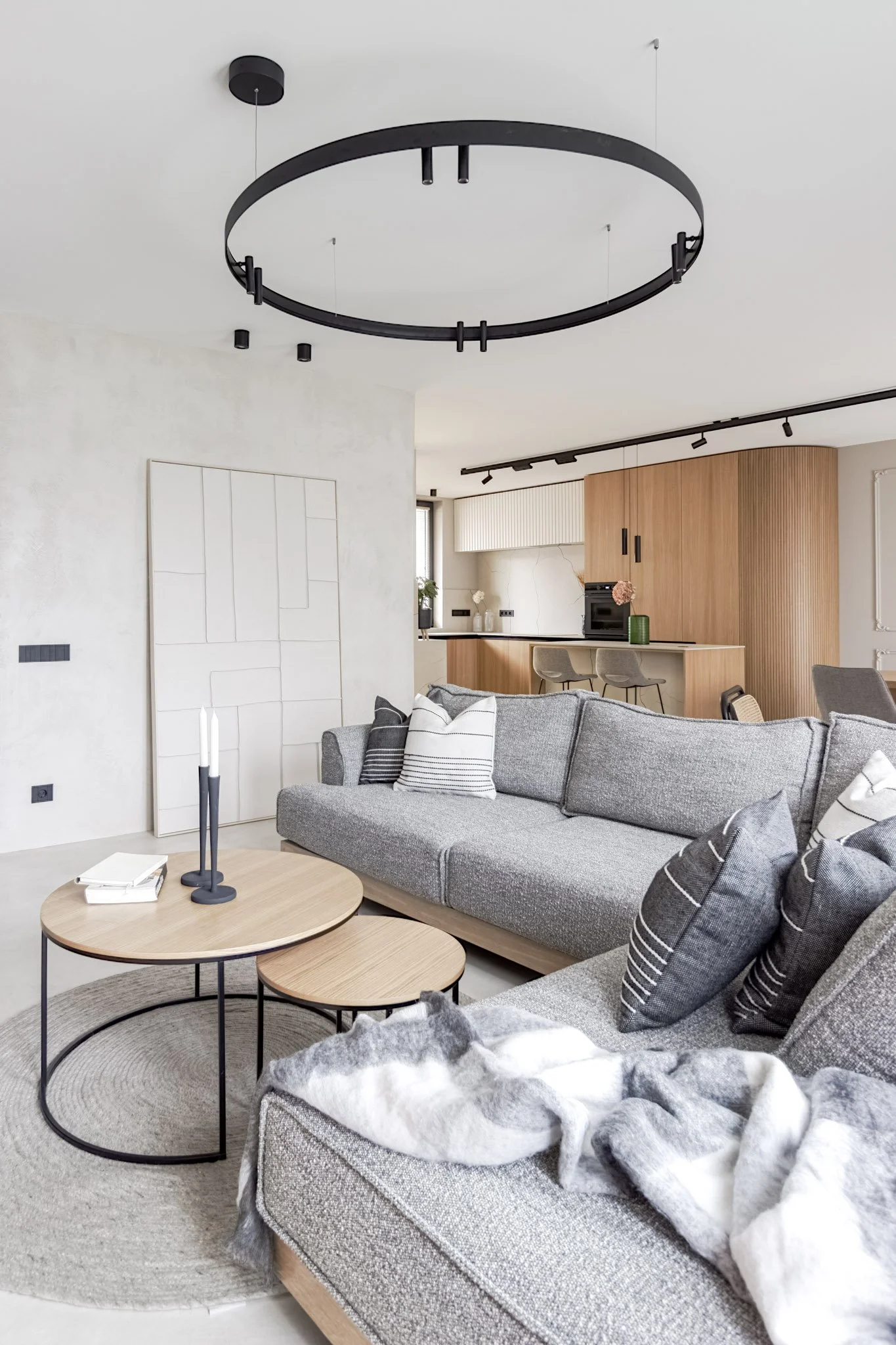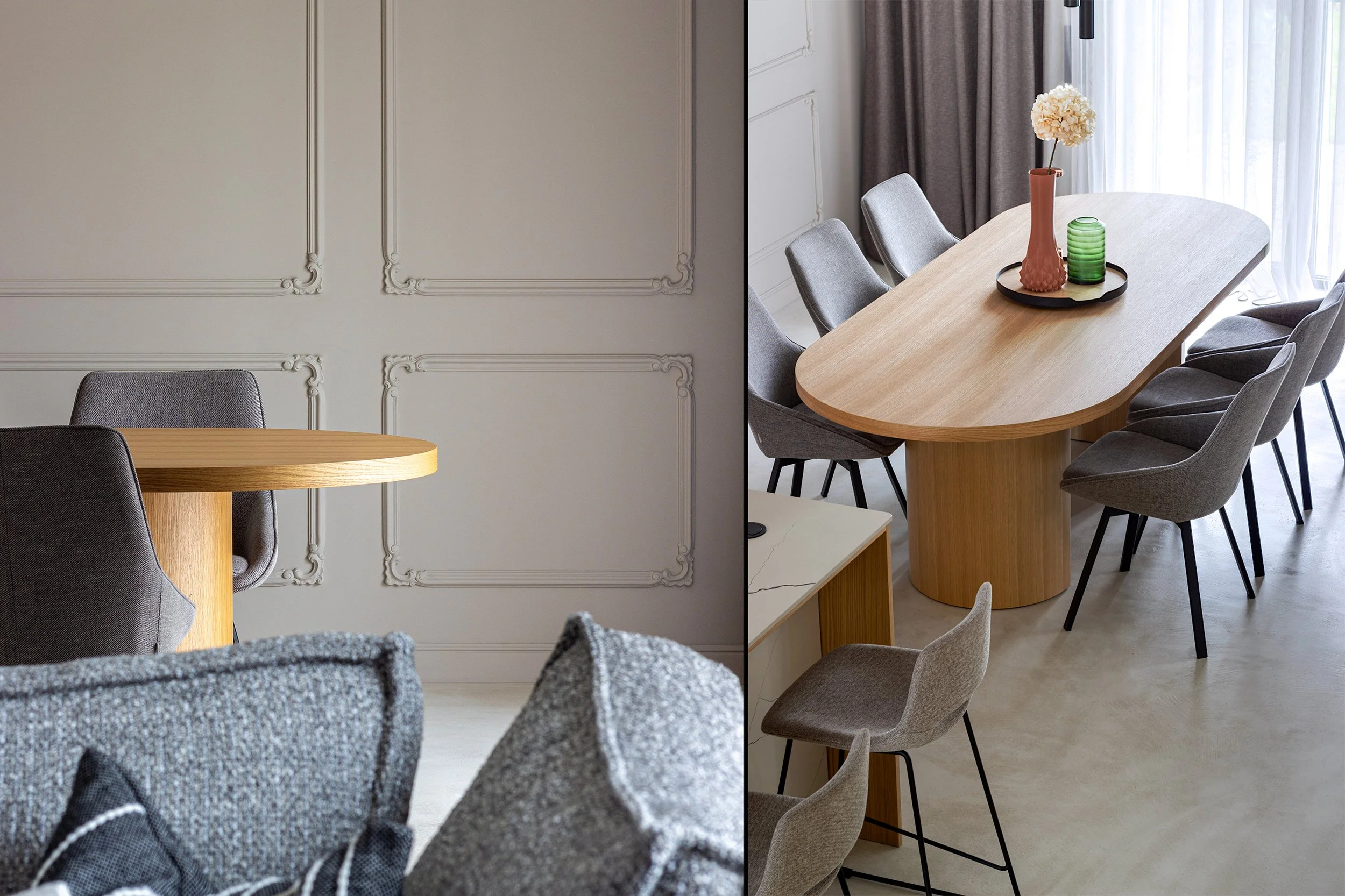 The dining area is defined by a centerpiece: a custom oval oak table that exudes timeless charm. Paired with upholstered gray chairs, it bridges style and comfort. The soft forms and natural tones lend a sense of warmth and serenity to the open-plan living space, ensuring both aesthetic appeal and functionality.