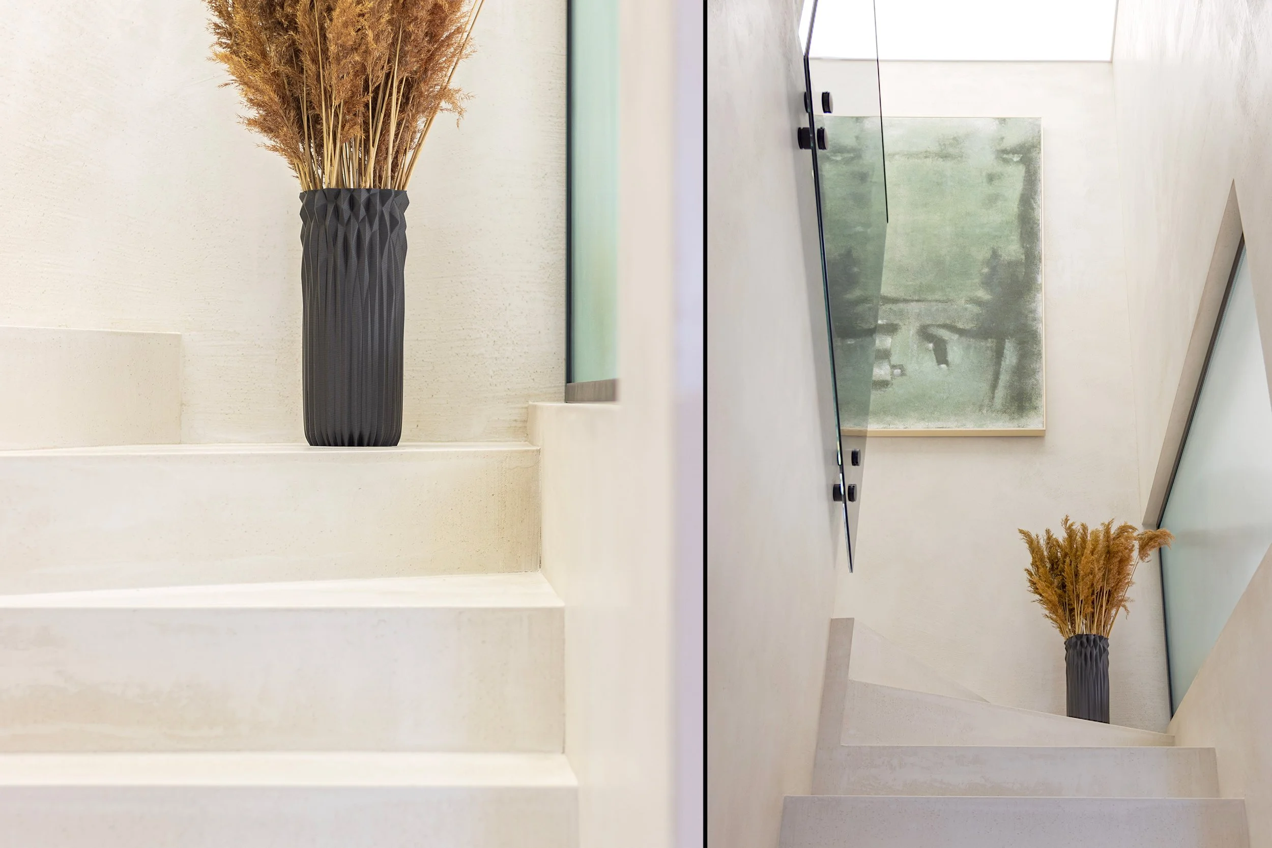 Polished Microcement Flooring: Covering the floors and parts of the walls, the seamless surface adds a monolithic and modern feel, uniting the different levels of the home.